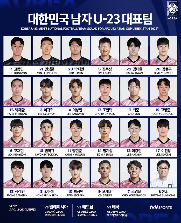 이 선수들이 앞으로 대한민국 축구를 이끌어갈 유망주들인데요, 저도 이강인,오세훈,조영욱,정상빈,엄지성,최준 선수정도알고 다른 선수들은 낯선데요, 이번 대회를 통해 더 많은 선수들이 대중들에게 자신의 이름을 각인시킬수 있었으면 좋겠네요!