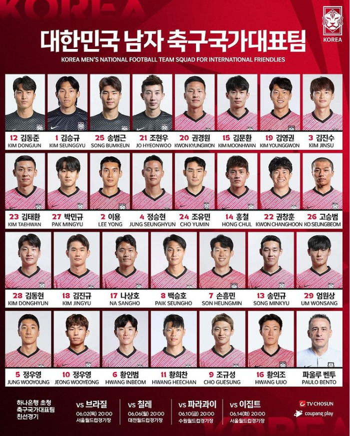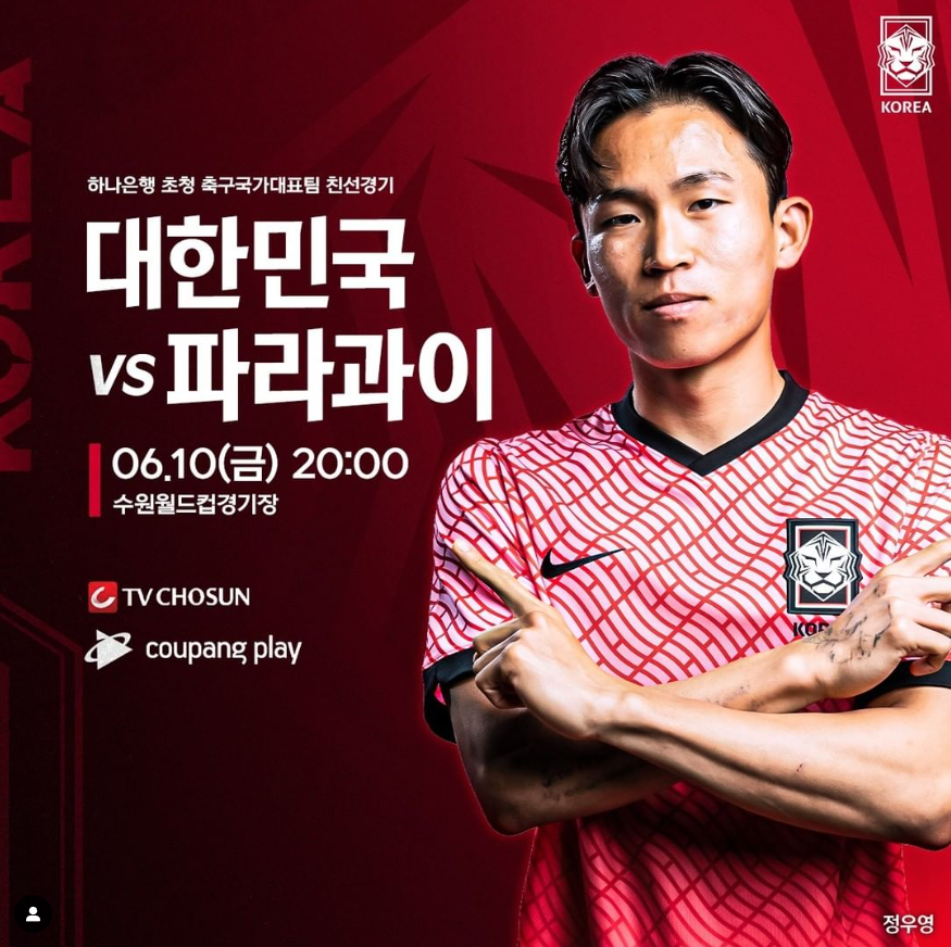 불금을 더욱 뜨겁게 만들어줄 파라과이와의 친선경기! 중계는 TV조선과 쿠팡플레이에서 진행이 되는데요, 저번 칠레전에 쿠팡플레이가 40분가량 서버가 다운되면서 많은 축구팬들의 애간장을 녹였습니다.. ㅠㅠ 이번에는 철저한 사전 준비를 해서 절대 서버가 다운되지 않았으면 좋겠어요!
