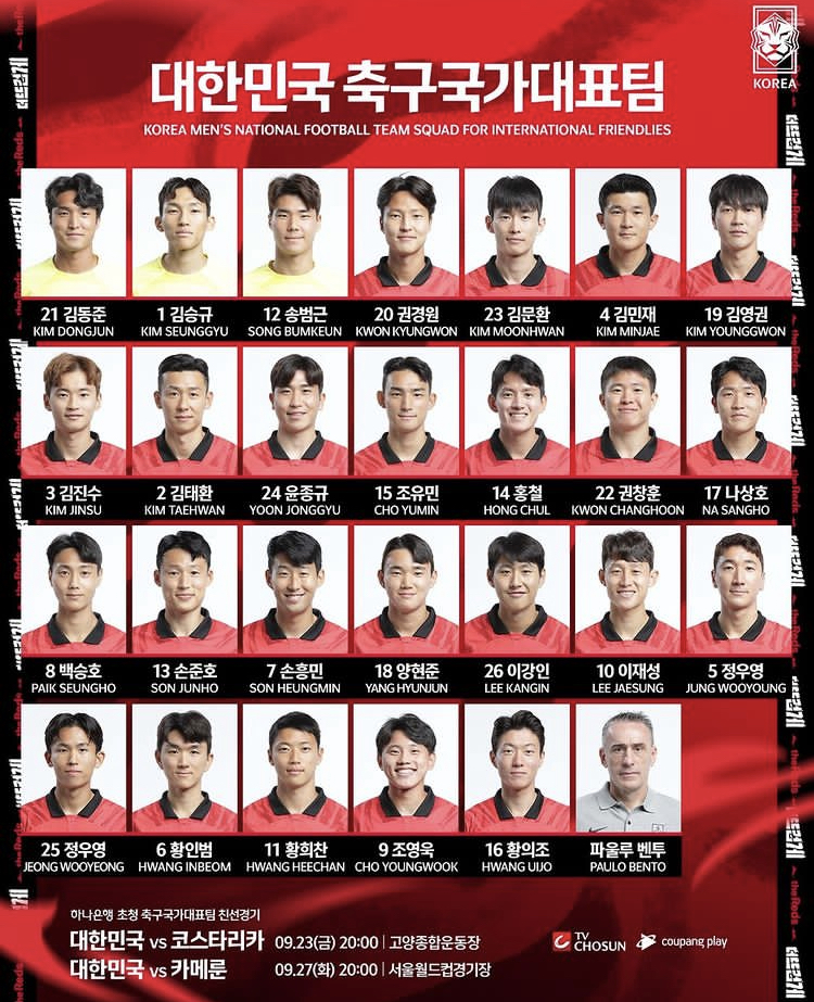 카타르 월드컵은 명단이 26인으로 늘어나면서 기존의 23인에서 3명의 선수가 추가되었습니다! 우리 대표팀은 공격진의 조규성 선수만 제외하면 사실상 완전체로 모였습니다! 과연 이 선수들이 4년간 어떤 준비를 했는지 이번 9월 친선2연전에서 볼 수 있을것 같아서 기대가 됩니다! 한편으로는 너무 다 보여주면 우리의 월드컵 경쟁자들이 분석을 할테니 어떻게 해야 할지 고민이 되네요ㅎㅎㅎㅎ